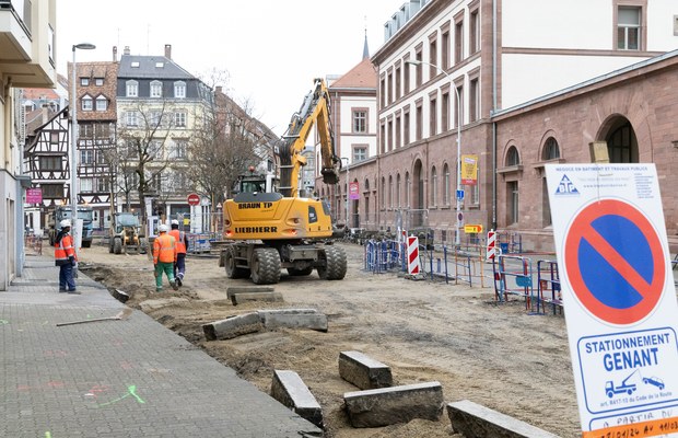 Ces offres s’adressent notamment aux habitantes et habitants du quartier. Car après avoir vécu en vase clos pendant des décennies, la Manufacture s’ouvre sur le quartier et les abords ont été réaménagés en ce sens de janvier à juin 2024. « 2000 personnes vont et viennent tous les jours, estime Alain Jund, vice-président de l’Eurométropole en charge des mobilités. Il fallait nécessairement réorganiser l’espace pour permettre les déplacements. » À l’arrière, la rue de la Manufacture est désormais une grande zone de rencontre piétonne et végétalisée. La rue de la Krutenau et la place du Pont-aux-Chats sont réorganisées, avec un trottoir élargi et une nouvelle piste cyclable de la rue Munch jusqu’à la rue Sainte-Catherine. Une bande végétalisée, abritant tables et chaises, sépare les espaces piétons et cyclistes et une voie a été conservée pour la circulation des bus et voitures. Sur les 7800 m² concernés par le réaménagement, 1000 m² sont dédiés aux espaces verts et 16 nouveaux arbres s’installent dans le paysage.