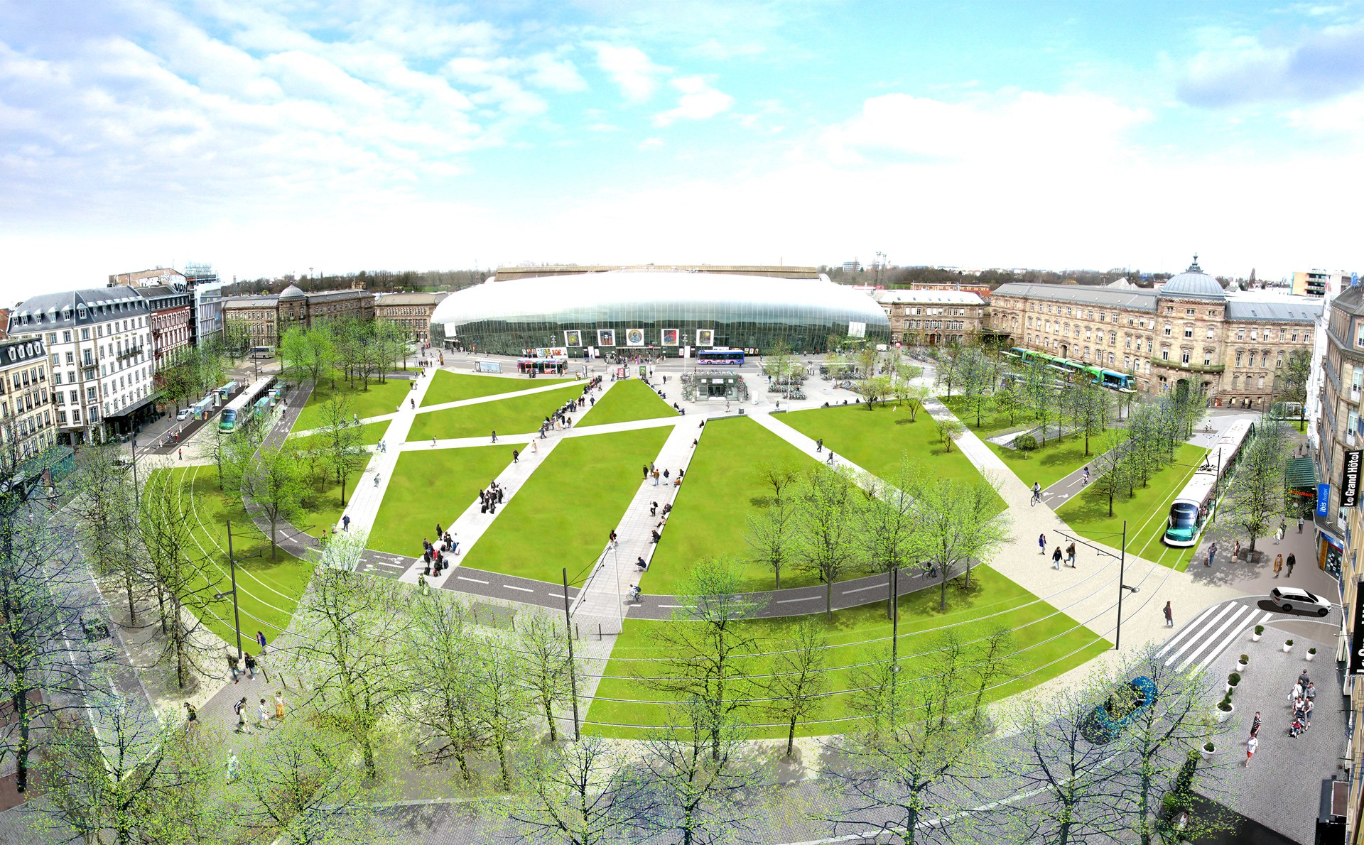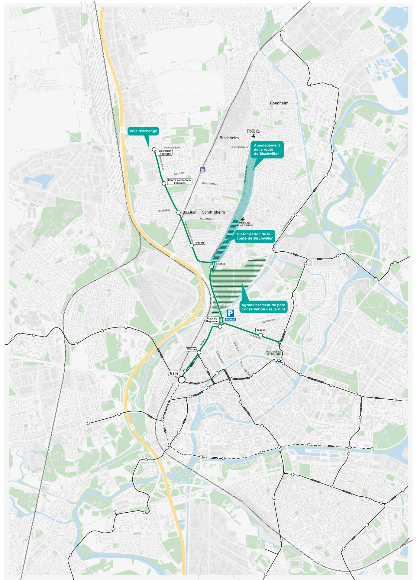 - La nouvelle ligne H, qui remplacera l'actuel bus H, partira de la gare pour assurer une desserte rapide et performante des Institutions européennes et les quartiers du Wacken et de Robertsau en passant par l'avenue des Vosges requalifiée.