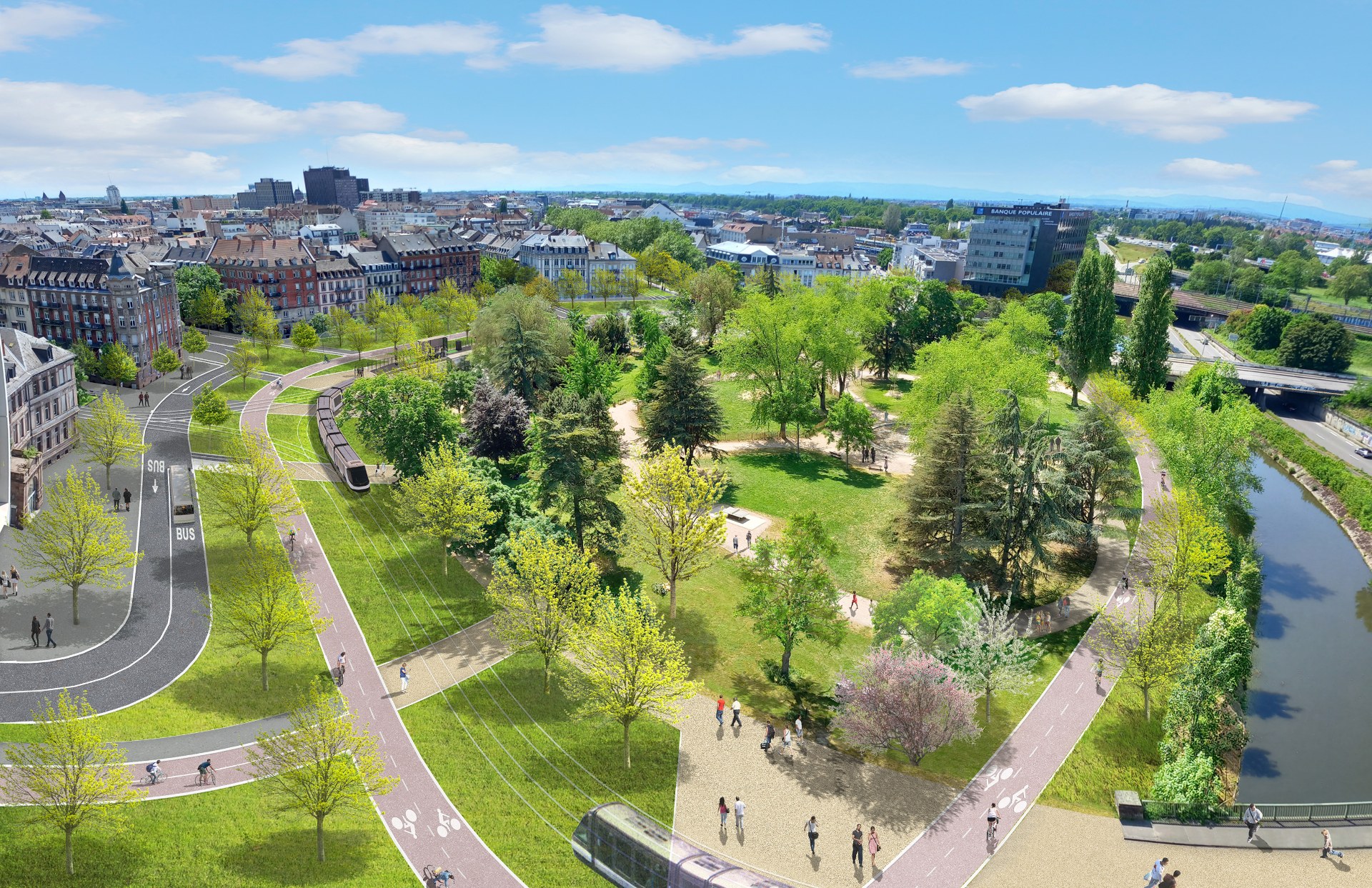 Plus largement, l'ensemble du plan de circulation sera remanié : ouverts aux voitures, les axes routiers peuvent aussi devenir structurants pour les cyclistes, les usagers des transports en commun et les piétons.